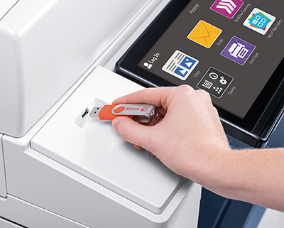 بر روی بدنه دستگاه کپی سه کاره رنگی زیراکس Altalink C8055 پورت USB 2.0 تعبیه شده که از طریق آن می توانید فلش مموری خود را به دستگاه متصل کرده و فایل های موجود بر روی آن را پرینت کنید. در این حالت احتیاجی به اتصال دستگاه کپی به کامپیوتر نیست و چاپ فایل ها به صورت مستقیم از روی فلش انجام می شود.
