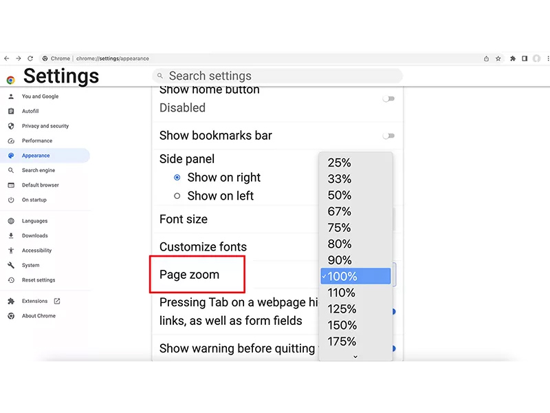 10- به منوی Appearance برگردید. در این قسمت می توانید اندازه زوم صفحه (Page Zoom) را بین 25 تا 500 درصد تنظیم کنید.