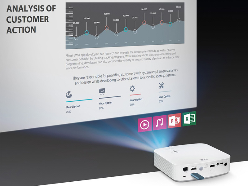 فقط کافی است تا فلش مموری خود را به پورت USB ویدئو پروژکتور ال جی PF50KG متصل کنید تا فیلم، عکس یا موزیک ذخیره شده بر روی آن پخش شود. همچنین در این حالت می توانید فایل های ورد، پاورپوینت یا اکسل را به صورت مستقیم از روی فلش مموری (بدون نیاز به اتصال به کامپیوتر) به نمایش بگذارید.