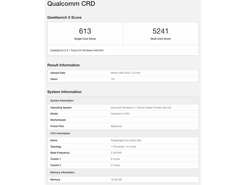 اطلاعات مربوط به تراشه اسنپ دراگون 8cx Gen 4 توسط یکی از توسعه دهندگان ویندوز بر روی Arm (WoA) به نام گووستاو مونک ارائه شده است. مطابق با این اطلاعات، پردازنده این تراشه دارای دو کلاستر با مجموع 12 هسته است که همان طور که اشاره شد، به صورت 8+4 هسته خوشه بندی شده اند. این مورد با گزارشی که پیش از این در مورد این تراشه منتشر شده بود، همخوانی دارد. علاوه بر این، در وب سایت Geekbench مشاهده می شود که کلاستر دوم پردازنده اسنپ دراگون 8cx نسل 4 توانایی دستیابی به سرعت 2.38 گیگاهرتز را دارد. این در حالی است که سرعت کلاستر اول این پردازنده 3.0 گیگاهرتز اعلام شده است. لازم به ذکر است که حداکثر فرکانس کلاسترهای اول و دوم این پردازنده به ترتیب برابر با 2.5 و 3.4 گیگاهرتز خواهد بود. در جدول زیر می توانید اطلاعات مندرج در وب سایت گیک بنچ در مورد تراشه Snapdragon 8cx Gen 4 را مشاهده کنید.